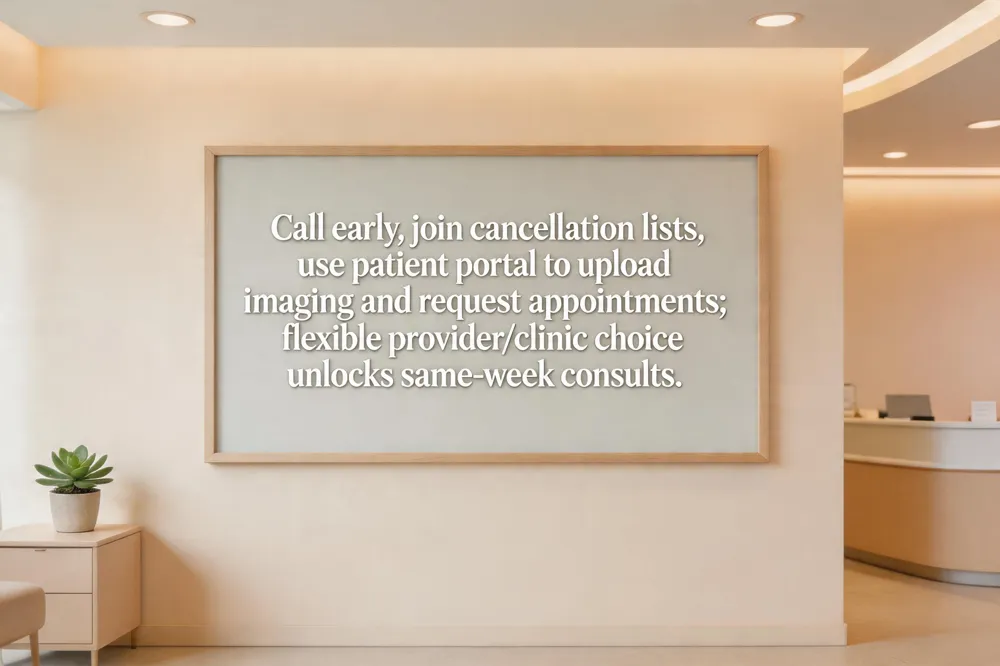 How to get a specialist to see you sooner? Call the clinic early, join a cancellation list, be flexible on time/location, use tele‑medicine, and ask your PCP for an expedited referral.