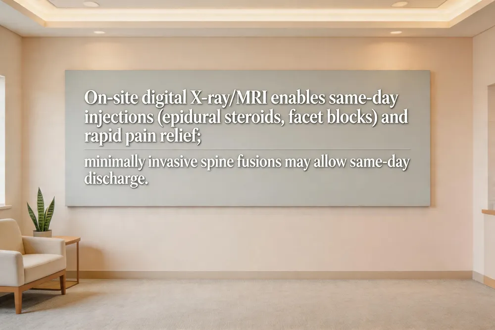 On‑site imaging—digital X‑ray, fluoroscopy, MRI/CT—lets urgent‑care and spine clinics diagnose fractures, disc disease, or stenosis during the same visit, eliminating delays. Same‑day injections such as epidural steroids, facet joint blocks, or radiofrequency ablation can be performed immediately after imaging, providing rapid pain relief and often avoiding surgery. Discharge after spinal fusion depends on the technique: minimally invasive, instrumented fusions may allow same‑day discharge if the patient is medically stable, pain‑controlled, and has home support, whereas traditional open fusions usually require a 2‑4‑day stay for graft monitoring and neurologic assessment. Referral pathways are streamlined through online portals, cancellation lists, and tele‑medicine triage; patients can request urgent slots, upload imaging, and receive fast‑track approvals.