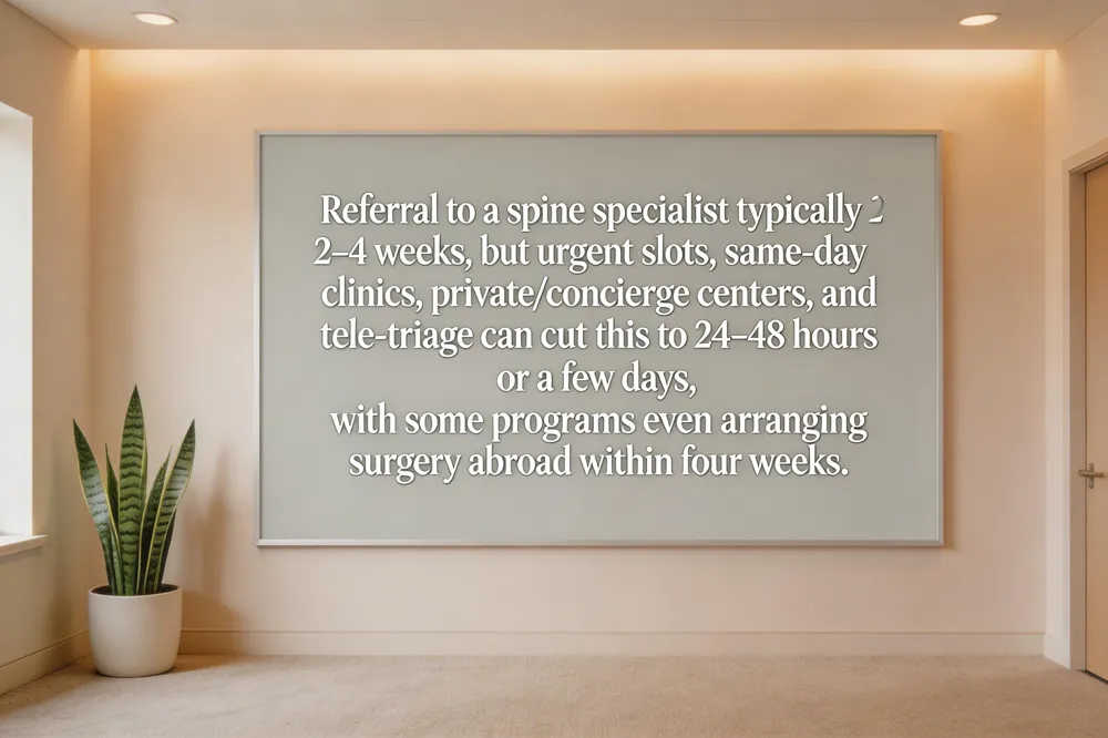In most U.S. health‑care systems, once your primary‑care physician sends a referral, patients typically wait 2–4 weeks for an initial appointment with a spine specialist. If your condition is marked as urgent—such as progressive weakness, loss of bladder control, or severe radiculopathy—clinics can often schedule you within a few days. Many practices now reserve urgent slots or operate same‑day clinics that see patients on the same or next business day, especially when imaging (MRI, CT, or X‑ray) is available on‑site. Private or concierge spine centers further compress the timeline: a one‑stop clinic can provide an evaluation, diagnostic imaging, and a treatment plan within 24‑48 hours, and some programs even arrange surgery abroad within four weeks to bypass domestic back lists. Online scheduling portals, tele‑triage hotlines, and electronic insurance verification also cut administrative delays, allowing patients to move from referral to care in days rather than weeks. By checking for urgent appointment availability, using clinics that offer same‑day or next‑day visits, and considering private options, you can significantly shorten the wait to see a spine specialist.