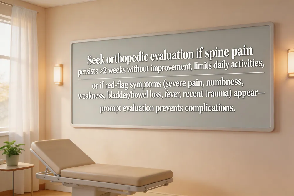 Red‑flag symptoms signal a more serious spine issue and require immediate attention. Watch for severe, unrelenting pain that limits bending or twisting, radiating pain with numbness, tingling, or weakness in an arm or leg, or a sudden loss of bladder or bowel control. Fever, unexplained weight loss, or pain after a recent injury may indicate infection, fracture, or severe nerve compression. If any of these signs appear, contact a spine specialist or an urgent‑care clinic within a few days to avoid complications and begin appropriate treatment.