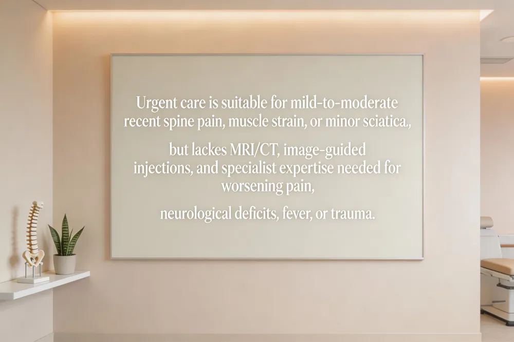 Limitations of urgent‑care visits compared with specialist evaluation Urgent‑care clinicians lack the advanced imaging (MRI/CT) and subspecialized expertise that board‑certified spine specialists offer. They cannot perform image‑guided injections, epidural steroid injections, or minimally invasive procedures such as spinal cord stimulator placement. Persistent, worsening pain, neurological deficits (numbness, weakness, incontinence), fever, or recent trauma require evaluation by a spine specialist—such as Dr. David S. Raskas at the Orthopedic Spine Institute of St. Louis—who can order MRI, conduct a thorough neurologic exam, and develop a comprehensive, patient‑first treatment plan.