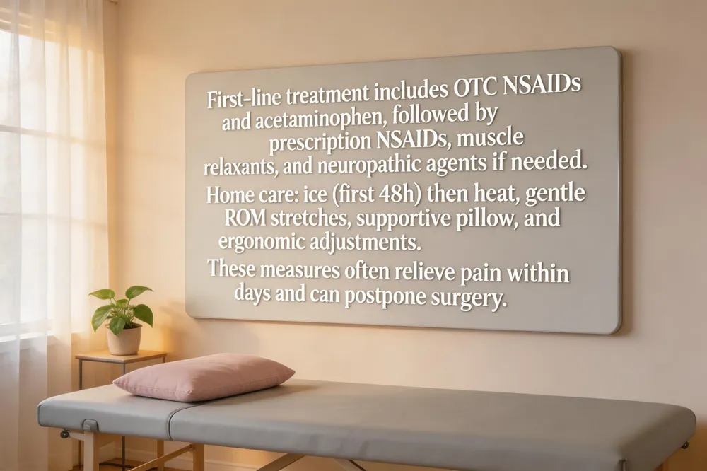 Effective neck‑pain relief often begins with medication strategies, home‑care techniques, and lifestyle adjustments. First‑line non‑surgical meds: OTC NSAIDs (ibuprofen, naproxen) and acetaminophen. If pain persists, Prescription options if needed: NSAIDs, muscle relaxants (cyclobenzaprine), neuropathic agents (gabapentin, pregabalin, duloxetine) may be used for nerve‑related symptoms. For rapid home relief, apply ice for the first 48 hours, then switch to heat for 20‑minute sessions several times daily. Gentle range‑of‑motion stretches (head tilts, chin‑to‑chest, shoulder‑blade squeezes) keep the neck mobile, while a supportive pillow and neutral sleeping position prevent aggravation. Ergonomic adjustments—screen at eye level, phone held up, shoulders rolled back—reduce strain during daily activities. These combined approaches often alleviate neck pain within days and can delay or avoid the need for surgery.