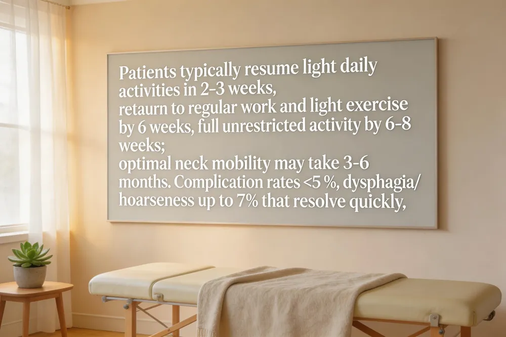 Post‑operative expectations after cervical disc replacement are generally optimistic. Most patients begin light daily activities within 2–3 weeks and are cleared for regular work and light exercise by the 6‑week mark; full unrestricted activity and vigorous exercise usually return around 6–8 weeks, although optimal neck mobility may take 3–6 months. For a C5‑C6 artificial disc replacement, symptom relief and functional improvement are reported in 85 %–95 % of patients, with long‑term success near 81 % at ten years—significantly higher than ACDF. The procedure’s total cost at the Orthopedic Spine Institute of St. Louis ranges from $30,000 to $50,000, with most major insurers covering the majority of expenses. Risk is low: serious complications occur in fewer than 5 % of cases, with temporary dysphagia or hoarseness affecting up to 7 % and resolving quickly. Physical‑therapy milestones start with gentle range‑of‑motion exercises within the first week, progressing to neck‑strengthening, posture training, and gradual cardio or yoga by week 4–6, ensuring a safe return to normal activities.
