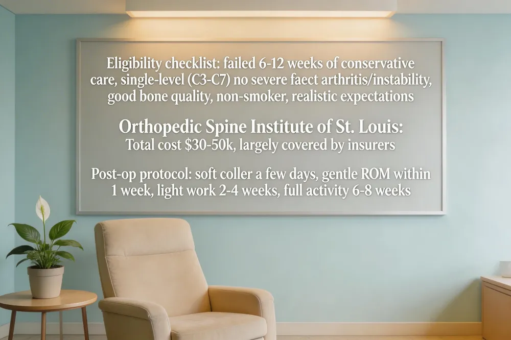 Cervical disc replacement (CDR) costs between $30,000‑$50,000 at the Orthopedic Spine Institute of St. Louis, covering surgeon fees, hospital charges, anesthesia and the artificial disc; most major insurers provide coverage when criteria‑based medical necessity is documented. Before deciding, use a checklist: (1) failed 6‑12 weeks of conservative care, (2) single‑level disease at C3‑C7 without severe facet arthritis or instability, (3) good bone quality and overall health (non‑smoker), and (4) realistic expectations of motion preservation and faster recovery. Post‑op, patients usually wear a soft collar for a few days, begin gentle range‑of‑motion exercises within a week, return to light work in 2‑4 weeks and full activity by 6‑8 weeks. CDR is worth it for eligible patients because it relieves pain, maintains neck motion, and lowers risk of adjacent‑segment disease.