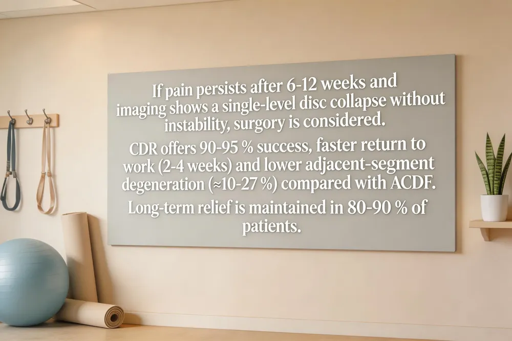 Cervical degenerative disc disease is first managed with physical therapy, activity modification, NSAIDs, and cervical traction. When pain persists after 6‑12 weeks, imaging confirms a single‑level disc collapse without instability, and surgery is considered. Cervical disc replacement (CDR) has become the preferred operation for many patients because it preserves motion, reduces stress on adjacent levels, and avoids bone grafts. Clinical studies report a success rate of 90‑95 % for CDR, comparable to anterior cervical discectomy and fusion (ACDF) but with faster return to work (2‑4 weeks) and lower adjacent‑segment degeneration (≈10‑27 % vs 23‑44 % for fusion). Long‑term data (up to 10 years) show 80‑90 % of patients maintain pain relief and functional improvement. Complications are rare (<5 %) and include dysphagia, hoarseness, device migration, and heterotopic ossification; failed discs present with persistent neck pain, radiculopathy, or limited motion.