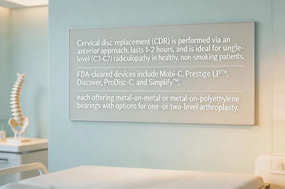 Cervical disc replacement (CDR) received FDA approval in 2007 and is performed via an anterior approach, removing the diseased disc and inserting the prosthetic disc. The operation typically lasts 1–2 hours. The surgeon removes the diseased disc and implants an artificial disc that preserves motion at the treated level. Ideal candidates have a single‑level problem between C3 and C7, radicular symptoms, no major instability or advanced arthritis, and are in good health (non‑smokers). Major FDA‑cleared cervical disc brands include Mobi‑C (Zimmer Biomet), Prestige LP™ (Medtronic), Discover (Globus Medical), ProDisc‑C (Synthes), and NuVasive’s Simplify™ platform, which uses a PEEK‑titanium endplate and a ceramic core. The Prestige cervical disc is a titanium‑carbide, two‑piece articulating device approved for single‑level use. Simplify™ differs from Mobi‑C by employing a metal‑on‑polyethylene design with a low‑profile height, while Mobi‑C offers a metal‑on‑metal bearing with a keel for added stability. Both Simplify™ and Mobi‑C are FDA‑cleared for one‑ and two‑level arthroplasty, providing surgeons with motion‑preserving options that reduce adjacent‑segment degeneration compared with fusion.