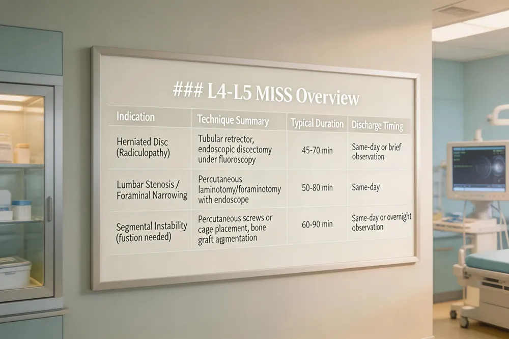 [Minimally invasive spine surgery L4‑L5](https://www.hopkinsmedicine.org/health/treatment-tests-and-therapies/minimally-invasive-spine-surgery) – MISS at L4‑L5 addresses herniated discs, stenosis, or instability using the techniques described above. Patients typically experience less postoperative pain, shorter hospital stays, and a quicker return to daily activities. Selection requires imaging confirmation and a trial of conservative therapy.