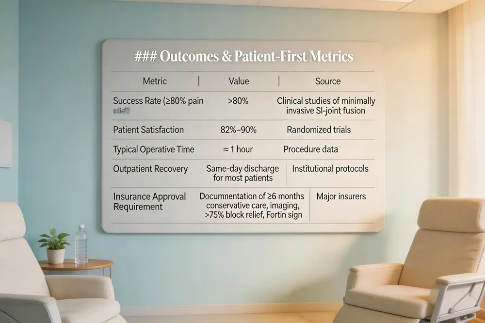 Success rates and patient satisfaction – Clinical studies of minimally invasive sacroiliac joint fusion report success rates greater than 80 % (more than 4 out 5 patients experience significant, lasting pain relief) and satisfaction rates ranging from 82 % to 90 % in randomized trials. The procedure’s high success is attributed to precise implant placement, short operative time (≈ 1 hour), and rapid outpatient recovery.