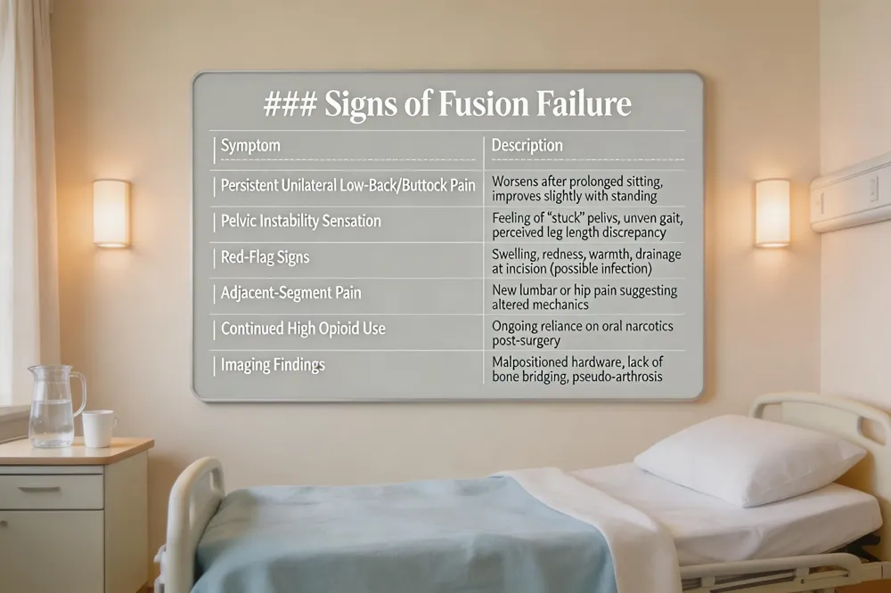 | Persistent pain after sacroiliac (SI) joint fusion is the most common clue that the procedure has not succeeded. Patients may still feel unilateral low‑back and buttock ache that worsens after prolonged sitting and improves only slightly with standing, often radiating down the posterior thigh or calf—essentially the original SI‑joint pattern. A sensation of pelvic "stuck" or instability, uneven gait, or a feeling that one leg is longer than the other can also appear. Red flag signs include swelling, redness, warmth, or drainage at the incision, suggesting infection of the hardware or surrounding tissue. New or increasing lumbar or hip pain may point to adjacent‑segment disease caused by altered mechanics after a failed fusion. Continued reliance on oral narcotics or other pain medication after surgery further signals that the joint has not healed properly. In such cases, imaging and clinical evaluation are needed to assess hardware positioning, bone healing, and the need for revision surgery. |
