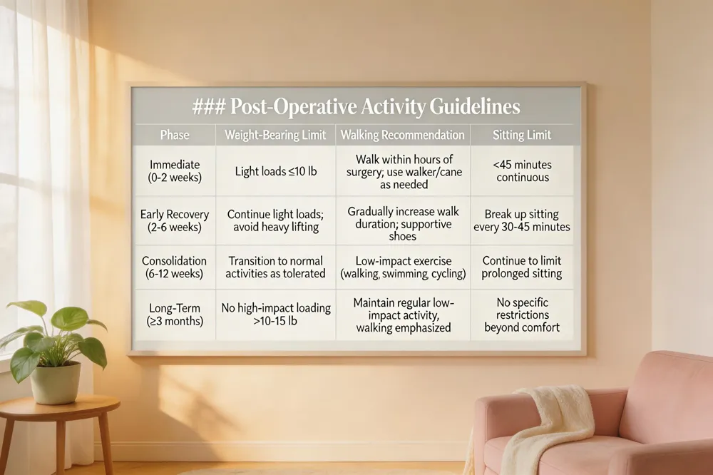 After the fusion is solid, permanent activity limits focus on avoiding high‑impact stress: heavy lifting over 10–15 lb, repetitive twisting, prolonged standing, and contact sports are generally discouraged for life. Low‑impact exercise—walking, swimming, stationary cycling—remains safe and is actively promoted. Walking, in particular, improves circulation, gently activates the core, and supports pelvic stability without overloading the hardware. Short, easy walks with supportive shoes, progressing to longer sessions as pain allows, help maintain mobility and prevent deconditioning.