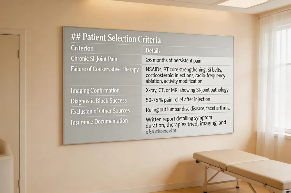 | Patient selection hinges on three core criteria: (1) chronic SI‑joint pain lasting at least six months, (2) documented failure of a comprehensive trial of non‑surgical therapy—including NSAIDs, physical‑therapy core, strengthening, SI belts, corticosteroid injections, radiofrequency ablation, and activity modification, and (3) imaging (X‑ray, CT, MRI) or diagnostic block confirming SI‑joint pathology and pain relief of 50‑75% after injection. Before surgery, clinicians must verify that the patient has exhausted these conservative options and that other sources of low back pain (lumbar disc disease, facet arthritis) have been ruled out. Insurance carriers typically require a written report detailing the duration of symptoms, the specific |