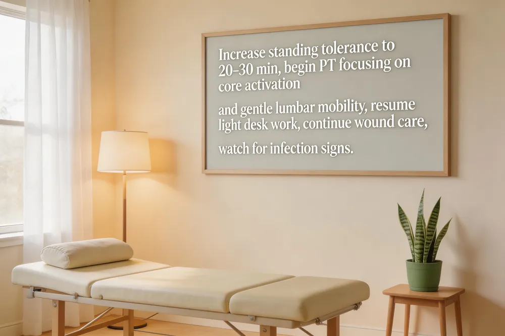 During the second to fourth week after a microdiscectomy patients shift from strict rest to a controlled increase in activity. Standing tolerance is still limited—short bouts of 5‑10 minutes are recommended at first, with gradual extensions every few days, aiming for 20‑30 minutes by week 2‑4 while taking breaks to avoid static strain. Early physical‑therapy programs begin in week 2, focusing on core activation (transversus abdominis, multifidus), gentle lumbar mobility, and low‑impact aerobic work such as walking or stationary cycling. Light, desk‑based work can often be resumed by week 3‑4, provided ergonomic support and frequent position changes are used. The incision should be clean, dry, and showing no signs of infection; dressing changes continue as needed and showers are permissible after 48‑72 hours. Monitoring for complications remains essential—watch for increasing redness, drainage, fever, new leg numbness, or worsening pain and contact the surgeon immediately if these occur. In summary, patients can stand longer, start structured PT, return to light duties, and continue wound care while staying vigilant for any warning signs.