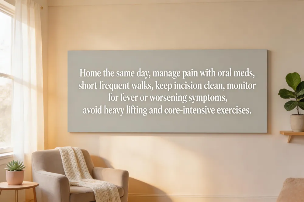 Going home the same day is usual; most patients leave after a short observation period. In the first 48‑72 hours back soreness, fatigue and drowsiness from anesthesia are common. Pain is controlled with prescribed oral analgesics; take them exactly as directed and avoid heavy meals if they upset your stomach. Short, frequent walks (5‑10 minutes, 3‑4 times daily) are encouraged to promote circulation, but excessive walking can increase pain—stop if discomfort rises. Keep incision clean and dry: wash daily with warm soapy water, pat dry, and leave steri‑strips or tape in place for about a week. Early symptom monitoring includes watching for fever, increasing redness, swelling, drainage, new numbness or weakness, and severe leg pain; contact your surgeon promptly if any occur. Buttock pain is often normal scar tissue‑related and resolves with gentle stretching and massage, but worsening or progressive pain should be evaluated. Avoid heavy lifting (>5–8 lb), bending, twisting, high‑impact activities, and core‑intensive exercises such as deadlifts, full sit‑ups, or rapid twisting until cleared by your surgeon.