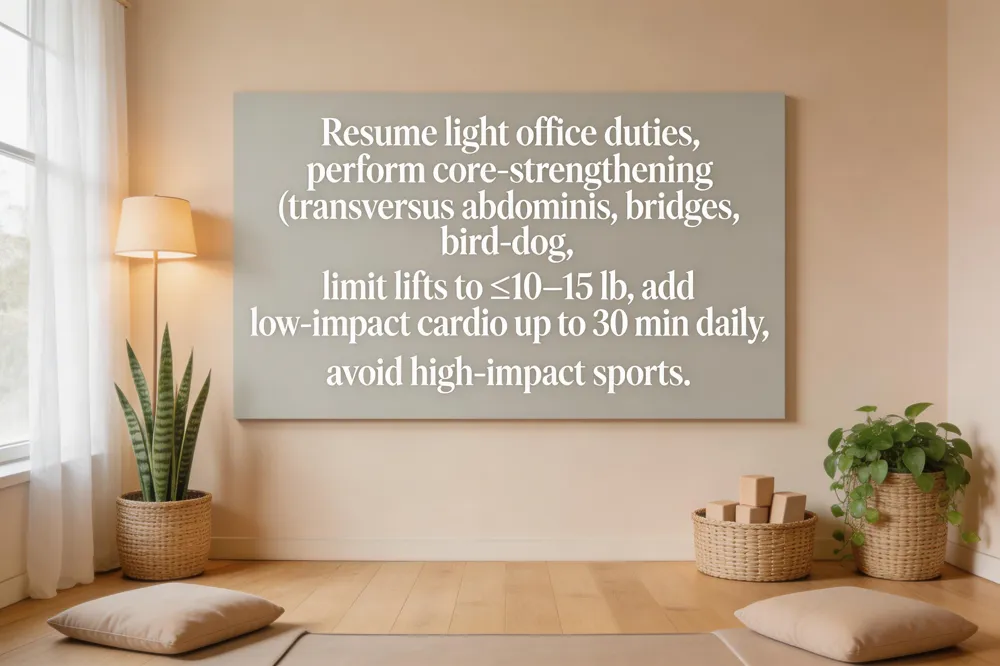 During weeks 5‑12 (approximately months 2‑3) the focus shifts from gentle walking to structured core‑stabilization exercises such as transversus abdominis activation, bridges, bird‑dog, and pelvic tilts. Physical therapists introduce light resistance (5‑15 lb) and multi‑planar movements while maintaining a neutral lumbar spine, preparing patients for safe lifting progression. By week 8 most individuals can resume low‑impact sports (walking, stationary biking, swimming) and begin a gradual return to higher‑impact activities if pain‑free and surgeon‑cleared.