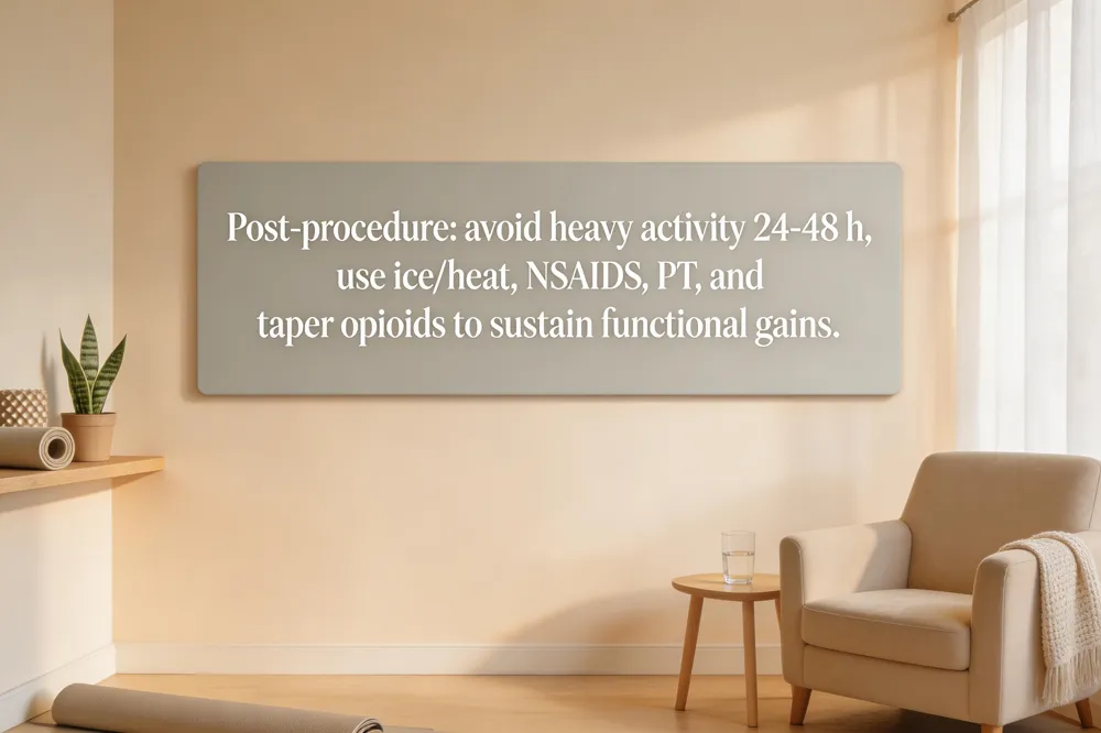 Common side‑effects & post‑procedure care – Most patients experience mild soreness, bruising, or a brief “steroid flare” that resolves in 48 h. Rare complications include infection, bleeding, nerve injury, or systemic steroid effects (e.g., temporary glucose rise or weight gain). After a 20‑30 min observation, patients should avoid heavy lifting, vigorous activity, and driving for 24‑48 h, use ice for swelling, and monitor for fever, worsening pain, or numbness.