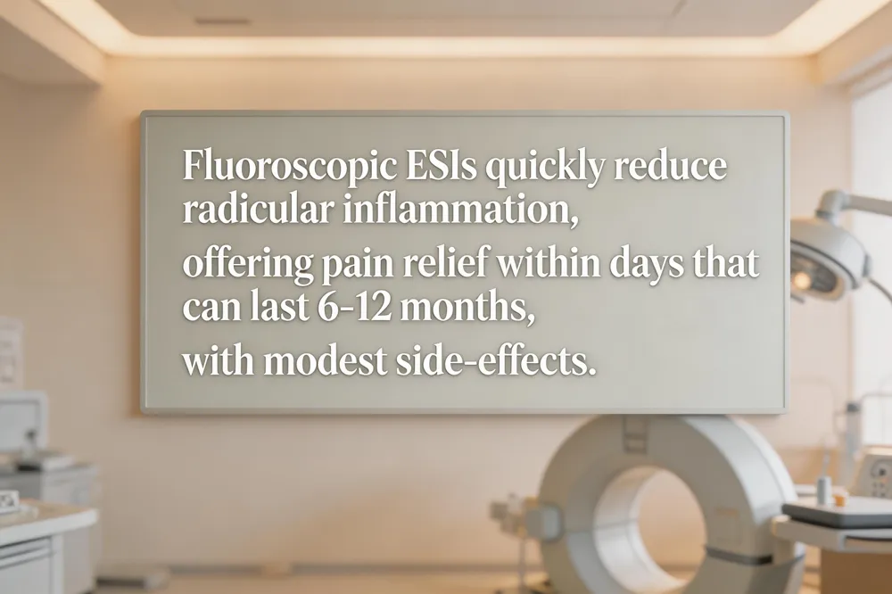 Advantages for radicular pain – By directly coating inflamed nerve roots, ESIs rapidly diminish swelling and pressure that cause sciatica, lumbar radiculopathy, and cervical radiculopathy. This relief often enables patients to engage more fully in physical therapy, improves mobility, and can postpone or avoid surgery.