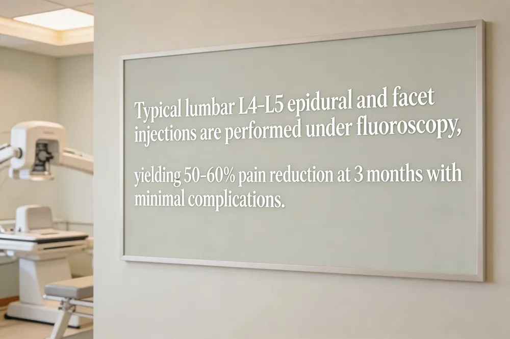 A lumbar epidural steroid injection at the L4‑L5 level delivers a potent anti‑inflammatory medication directly into the epidural space around the nerve roots that exit between the fourth and fifth lumbar vertebrae. Performed under fluoroscopic guidance with a local anesthetic, it is an outpatient procedure that typically provides significant pain reduction within a few days; studies show a ≥50 % pain‑score drop in about 50‑60 % of patients at three months, with short‑term relief lasting up to several months. Common side‑effects include a brief “steroid flush,” facial warmth, temporary swelling, sleep disturbances, and a mild increase in pain that resolves quickly; complications are uncommon such as infection or nerve injury are rare.