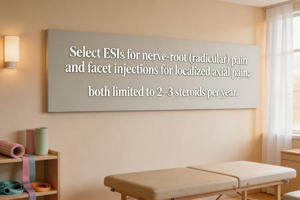 Radicular pain (leg/arm shooting) benefits from epidural delivery, often via transforaminal or interlaminar approaches, providing relief that can last weeks to months. Axial pain (neck or low‑back ache) responds better to facet injections, which may be repeated more frequently and can serve as a diagnostic tool. Both procedures are minimally invasive, performed under fluoroscopic guidance, and aim to enable participation in physical therapy while avoiding unnecessary surgery.