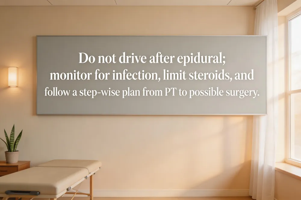 After epidural or facet the patients is should advised to avoid heavy lifting, vigorous exercise, and prolonged sitting for the first 24‑48 hours. Light activity—walking, gentle stretching, and core‑strengthening exercises—helps prevent stiffness and promotes circulation while the anesthetic wears off. Ice for 15‑20 minutes several times daily during the first two days reduces inflammation; thereafter a warm pack can relax musculature. Strong painkillers such as opioid analgesics are reserved for short‑term use when over‑the‑counter NSAIDs or acetaminophen fail to control breakthrough pain, and they should be tapered as soon as the injection’s anti‑inflammatory effect begins. Non‑drug strategies—physical‑therapy integration, posture training, and low‑impact cardio—are essential to translate temporary relief into lasting functional improvement. Women may require special attention to hormonal influences on ligament laxity and bone density; a focus on pelvic‑floor stability, weight‑bearing exercises, and adequate calcium/vitamin D supports spinal health.