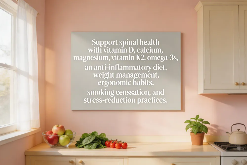 Optimal spine health starts with key nutrients. Vitamin D is the most critical vitamin for the spine because it boosts calcium absorption, essential for strong vertebrae, and supports muscle function while reducing inflammation. Vitamin K2 works with D to direct calcium into bone and away from soft tissue. Adequate calcium and magnesium further reinforce bone density and disc hydration, while omega‑3 fatty acids help dampen inflammatory pathways. An anti‑inflammatory diet rich in leafy greens, berries, oily fish, and nuts, combined with weight management, lowers mechanical load on the spine and reduces pain flare‑ups. Ergonomic habits—maintaining neutral posture at a workstation, using supportive chairs, and taking micro‑breaks—protect spinal alignment at home and work. Finally, quitting smoking and practicing stress‑reduction techniques such as mindfulness or yoga improve circulation and decrease inflammation, supporting spinal resilience.