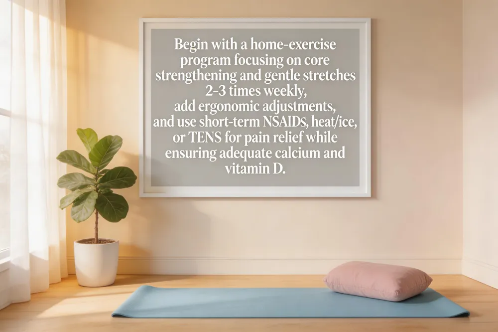 Women experience back pain from hormonal shifts (e.g., menopause‑related bone density loss), pregnancy‑induced postural changes, and anatomical factors such as sacroiliac joint dysfunction. A conservative, non‑surgical plan is the first line of care. Begin with a home‑exercise program that emphasizes core‑strengthening (bridges, shoulder‑blade squeezes) and gentle stretches (knee‑to‑chest, cat‑cow, lower‑back rotations) performed 2‑3 times per week, complemented by low‑impact aerobic activity. Ergonomic adjustments at work and home—supportive chairs, monitor at eye level, avoiding prolonged bending—help maintain spinal alignment. Short‑term pain relief with NSAIDs, heat/ice, and TENS can be achieved with over‑the‑counter NSAIDs, alternating heat‑ice packs, and TENS when needed; ensure adequate calcium and vitamin D for bone health. If pain persists beyond a few weeks or is accompanied by neurological symptoms, seek evaluation by a spine specialist or physical therapist for personalized treatment, possible imaging, and targeted interventions such as epidural steroid injections. This multidisciplinary, patient‑first approach often avoids surgery, restores function, and improves quality of life.