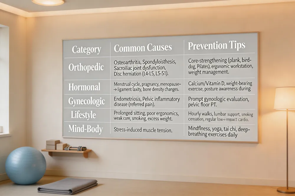 Women experience back pain for a unique blend of orthopedic, hormonal, and lifestyle reasons. Orthopedic contributors include common conditions such as osteoarthritis, spondylolisthesis, and sacroiliac joint dysfunction. A wider pelvis changes spinal curvature and places extra strain on the lumbar spine, while disc herniation—particularly at L4‑L5 and L5‑S1—can compress nerve roots and trigger sciatica. Hormonal fluctuations during menstrual cycles, pregnancy, and menopause affect ligament laxity and bone density, making the spine more vulnerable to strain. Gynecologic issues like endometriosis or pelvic inflammatory disease may also refer pain to the lower back. Lifestyle factors—prolonged sitting, poor ergonomic habits, weak core muscles, excess weight, and smoking—exacerbate these underlying problems.