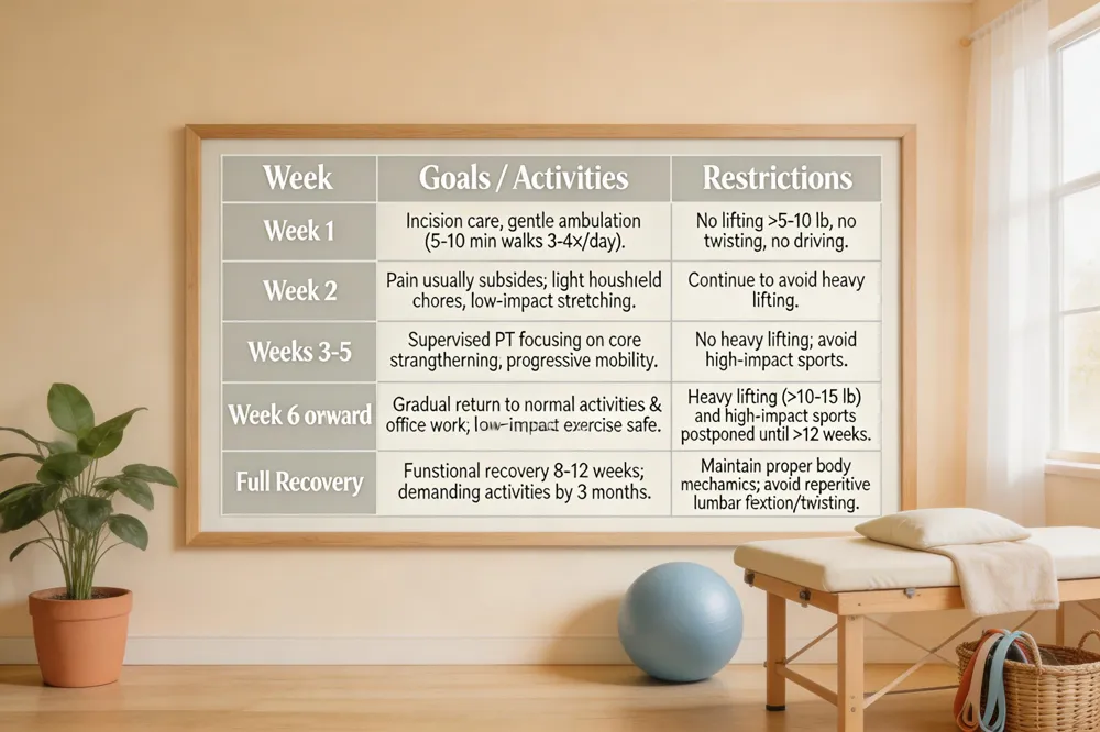 - Weeks 3‑5: Supervised physical therapy emphasizing core strengthening; continue avoiding heavy lifting.