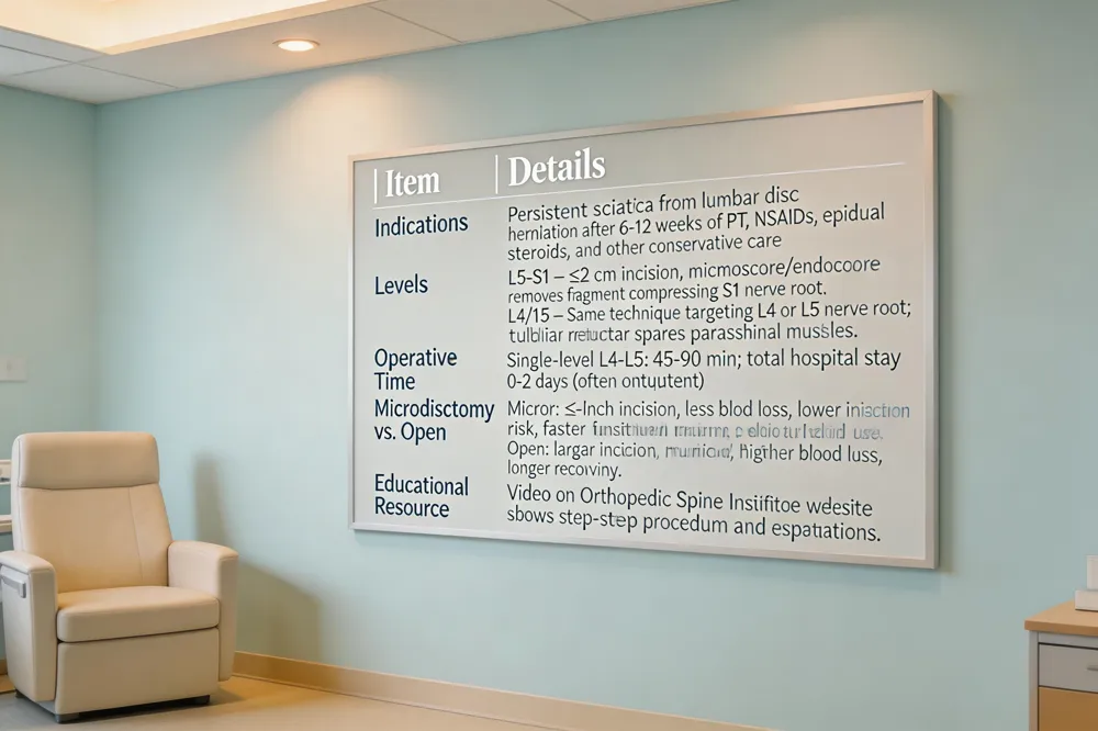 Microdiscectomy is a minimally invasive, spine‑sparing surgery performed when 6‑12 weeks of physical therapy, NSAIDs, epidural steroids, and other conservative measures fail to relieve sciatica caused by a lumbar disc herniation. Microdiscectomy L5‑S1 – A ≤2 cm incision over the L5‑S1 level allows a microscope or endoscope to remove the herniated fragment compressing the S1 nerve root, preserving surrounding muscle and ligamentous tissue. Patients typically experience rapid leg‑pain relief and can be discharged same‑day or after an overnight stay. Microdiscectomy L4/L5 – The same technique targets disc material irritating the L4 or L5 nerve root. The tubular retractor spares the paraspinal muscles, resulting in less postoperative pain and a return to light duties within 4‑6 weeks. Operative time – Single‑level L4‑L5 procedures average 45‑90 minutes; total hospital time is usually 0‑2 days. Microdiscectomy vs. open discectomy – Open discectomy requires a larger incision and muscle division, leading to higher blood loss, infection risk, and longer recovery. In contrast, microdiscectomy’s ≤1‑inch incision, microscopic visualization, and tissue‑preserving approach produce shorter stays, lower opioid use, and faster functional return. Educational video – The Orthopedic Spine Institute’s website hosts high‑quality videos showing the small incision, microscope guidance, and step‑by‑step disc removal, helping patients set realistic expectations and understand the procedure.