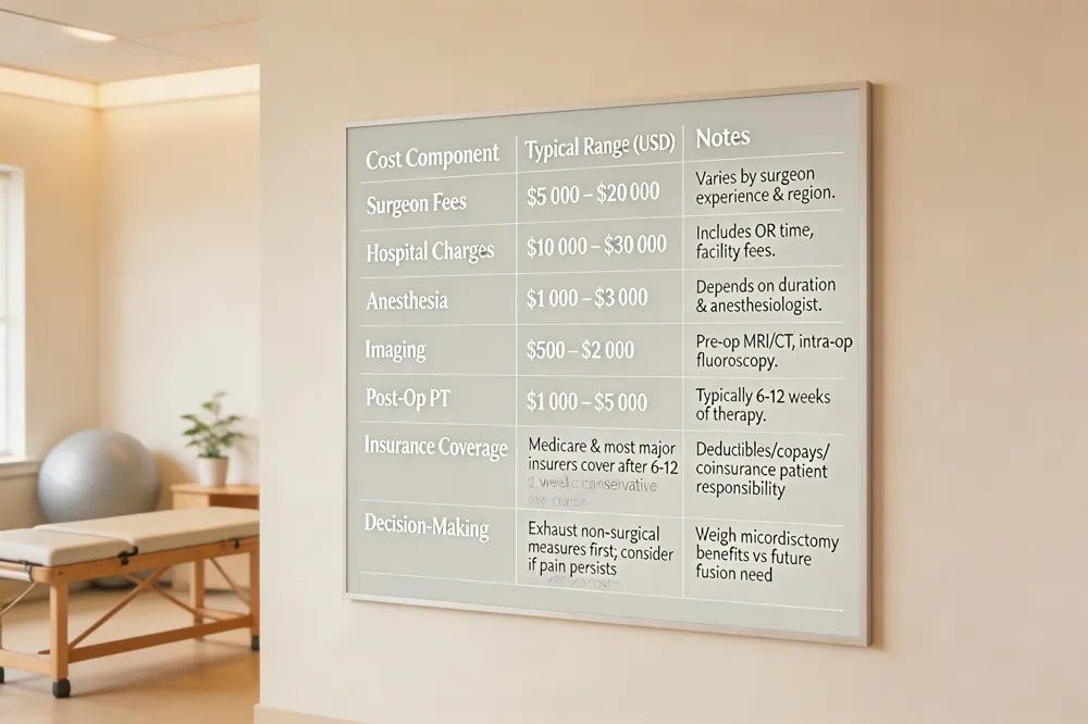 Microdiscectomy is a common minimally invasive option for lumbar disc herniation, and its cost can be a deciding factor for many patients. In the United States the total expense typically ranges from $20,000 to $50,000, broken down into surgeon fees ($5‑$20 k), hospital charges ($10‑$30 k), anesthesia ($1‑$3 k), imaging ($0.5‑$2 k) and postoperative physical therapy ($1‑$5 k). Most major insurers, including Medicare, will cover a microdiscectomy when it is deemed medically necessary after a documented trial of 6‑12 weeks of conservative care, but patients are still responsible for deductibles, copays, and coinsurance.