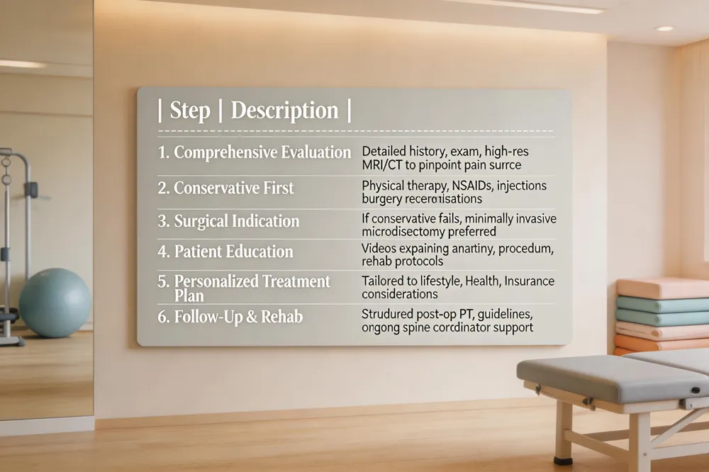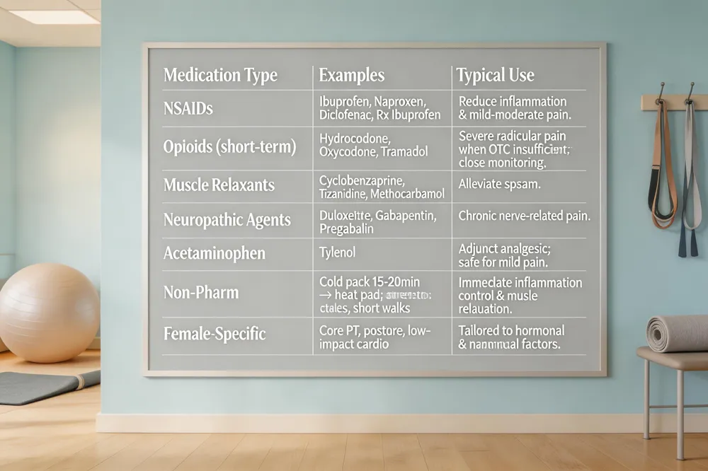 Female‑specific care: Begin with activity modification, heat/cold therapy, and NSAIDs. Emphasize core‑strengthening PT, posture correction, and low‑impact cardio. For persistent pain, minimally invasive options such as epidural steroid injections or endoscopic decompression are considered, with attention to hormonal changes and pregnancy‑related considerations.
