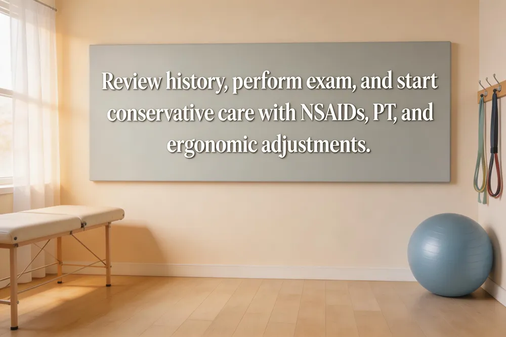The initial treatment plan is almost always conservative. First‑line options include NSAIDs (ibuprofen or naproxen) for pain and inflammation, acetaminophen when NSAIDs are contraindicated, and short‑term muscle relaxants for spasm. Ergonomic changes—proper workstation height, supportive pillows, and frequent micro‑breaks—help reduce strain. Heat or cold therapy, gentle neck stretches, and posture correction are also emphasized.