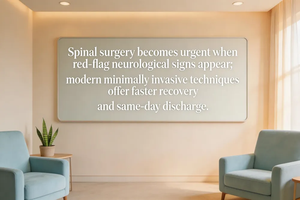 Spinal surgery is rarely required for routine back or neck pain; most patients improve with physical therapy, medication, or targeted injections. It becomes an emergency when red‑flag neurological signs appear—progressive weakness in the arms or legs, loss of bowel or bladder control, sudden severe pain, or signs of spinal cord compression. In these cases, immediate imaging and specialist evaluation are critical to prevent permanent nerve damage.