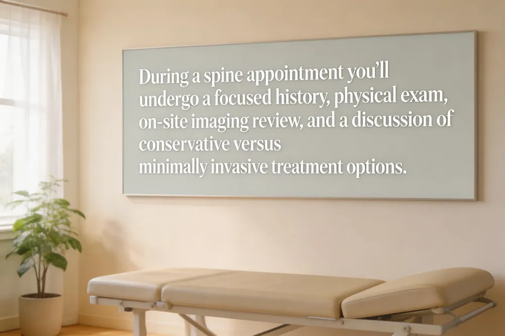 What happens at a spinal appointment? After intake, the doctor conducts a focused history, physical exam, imaging review, and then discusses diagnosis, treatment options, insurance coverage, and next steps.