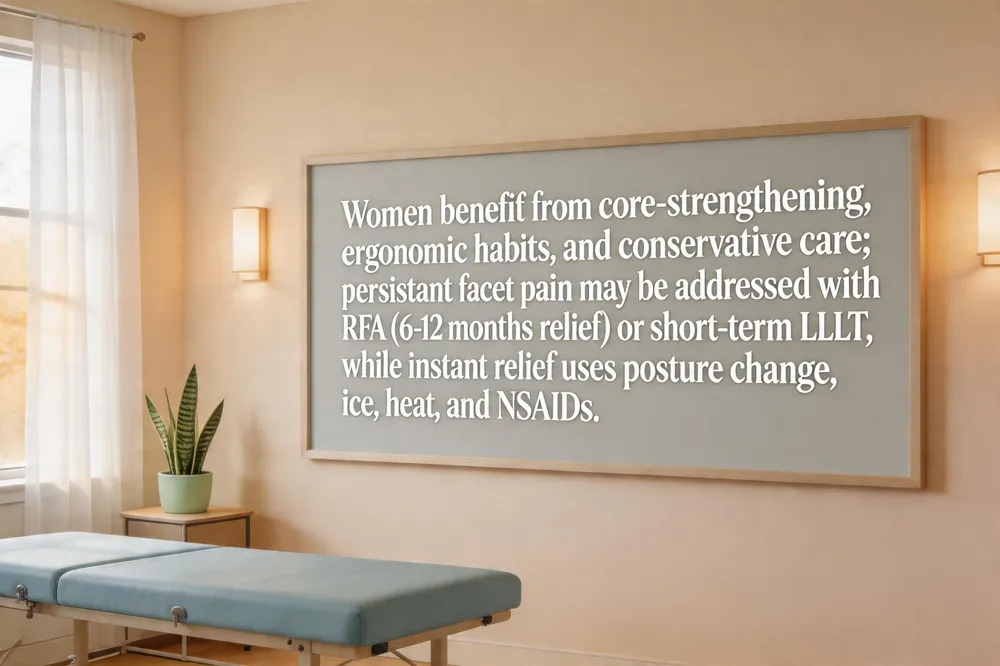 Women with back pain benefit from a core‑strengthening routine (bridges, cat‑cow, knee‑to‑chest) and ergonomic habits—upright sitting, frequent micro‑breaks, and proper sleep pillows—to reduce strain. Upper‑back discomfort is first managed conservatively with NSAIDs, heat/ice, and posture‑corrective stretches; if pain persists, minimally invasive options such as radiofrequency ablation (RFA) can provide 6‑12 months of relief for facet‑joint irritation, while low‑level laser therapy (LLLT) offers short‑term, non‑thermal pain reduction. For instant relief, change posture, apply a 15‑minute cold pack followed by gentle stretching, and consider an over‑the‑counter NSAID if appropriate. Severe pain warrants alternating cold and warm compresses, brief rest, and early activation of low‑impact activities (walking, swimming) plus the core‑strength program; persistent severe symptoms should trigger a prompt evaluation for RFA or laser‑based interventions. Home‑based fast relief combines 15 minutes of targeted stretches, ice for the first 48‑72 hours, then heat, NSAIDs, and posture awareness to restore function quickly.
