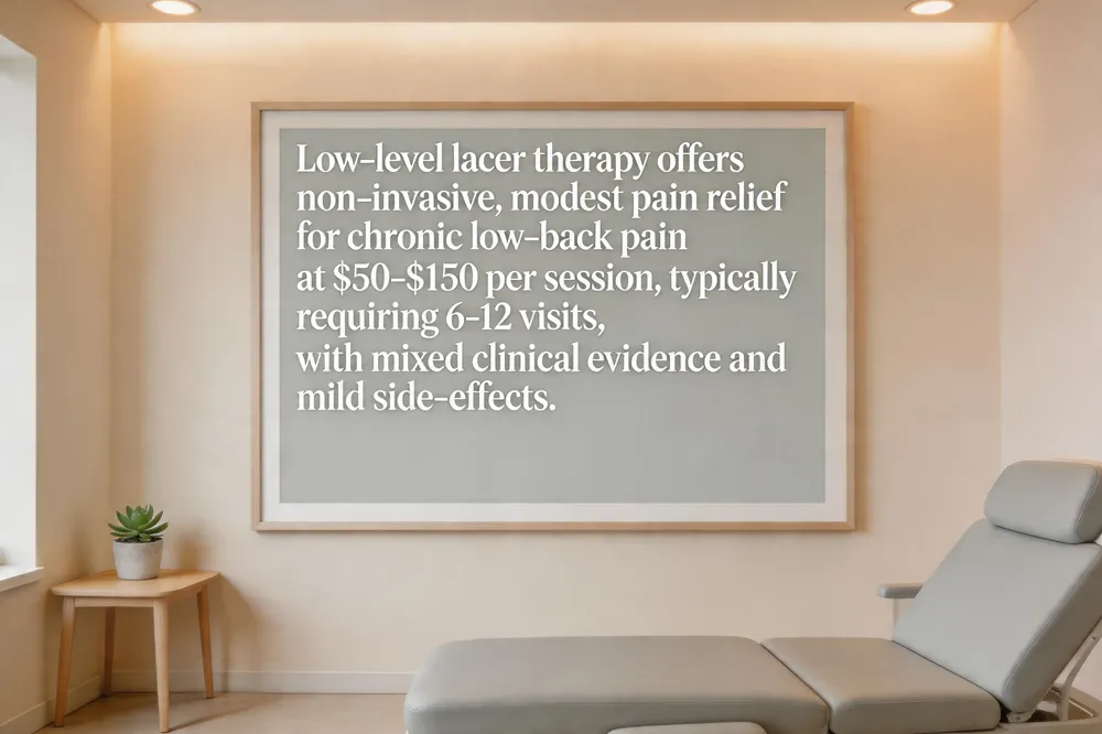 The Mayo Clinic describes low‑level laser therapy (LLLT) as a non‑invasive, painless option that uses specific wavelengths to reduce inflammation and promote cellular repair in chronic low‑back pain. Early trials show modest pain‑reduction, but LLLT remains an adjunctive, experimental approach after physical therapy and NSAIDs. A typical U.S. session costs $50‑$150; most patients need 6‑12 visits, bringing total out‑of‑pocket expenses to $300‑$1,800, with variable insurance coverage. Clinical evidence is mixed: some studies report 30‑50 % pain relief and functional gains, while others find no benefit over sham. Common drawbacks include the need for multiple appointments and unpredictable efficacy; side‑effects are usually mild—tingling, warmth, transient skin redness—rarely burns or nerve irritation. Patients in St. Louis often choose the Orthopedic Spine Institute, which offers Class IV laser treatments; reviews note modest improvement but stress that results vary and insurance may be limited.