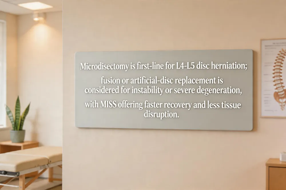 For an isolated L4‑L5 disc bulge that compresses a nerve root and causes leg pain, microdiscectomy remains the preferred first‑line surgery because it removes the offending fragment while preserving most disc motion. If the disc is severely degenerated, the segment unstable, or facet arthritis is present, a lumbar fusion (instrumented posterolateral or TLIF) may be recommended to restore stability; artificial‑disc replacement is an option for select patients with healthy facet joints. At the L5‑S1 level, minimally invasive spine surgery (MISS) uses tubular retractors and real‑time imaging to remove herniated material, place an interbody cage, and/or add posterior instrumentation, yielding less pain, reduced blood loss, and faster return to activity than open surgery. Ideal candidates for MISS are patients who have failed conservative care, have imaging‑confirmed pathology amenable to a small surgical corridor, are in good overall health, and are motivated to engage in postoperative rehabilitation. Dr. David S. Raskas evaluates each case to match the most effective, patient‑first procedure to the individual’s anatomy and goals.