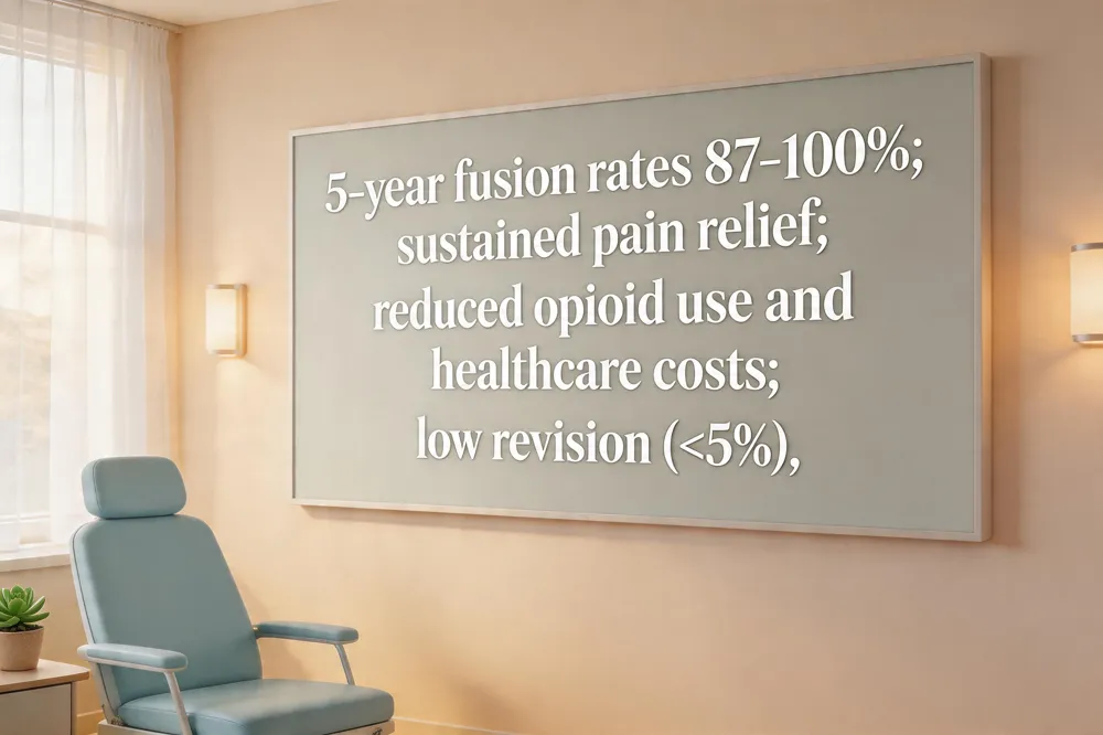 Five‑year follow‑up studies of minimally invasive sacroiliac (SI) joint fusion consistently show durable clinical and radiographic success. Fusion rates of intra‑articular osseous bridging reach 87 %–100 % at 5 years, with no evidence of implant loosening or migration. Patients experience sustained pain relief: mean VAS scores fall from the high‑7 range pre‑operatively to around 2–3 points, and 88 % achieve Substantial Clinical Benefit (SCB) with Oswestry Disability Index scores indicating only minimal‑to‑moderate disability. Reoperation is rare; revision surgery rates stay below 5 % (≈3 % in large trials), and complications such as infection, nerve irritation, or hardware failure remain infrequent. Economically, successful fusion reduces long‑term healthcare utilization—opioid use declines by ~30 % and the need for repeat imaging or additional interventions drops—making the procedure cost‑effective for insurers and patients alike.