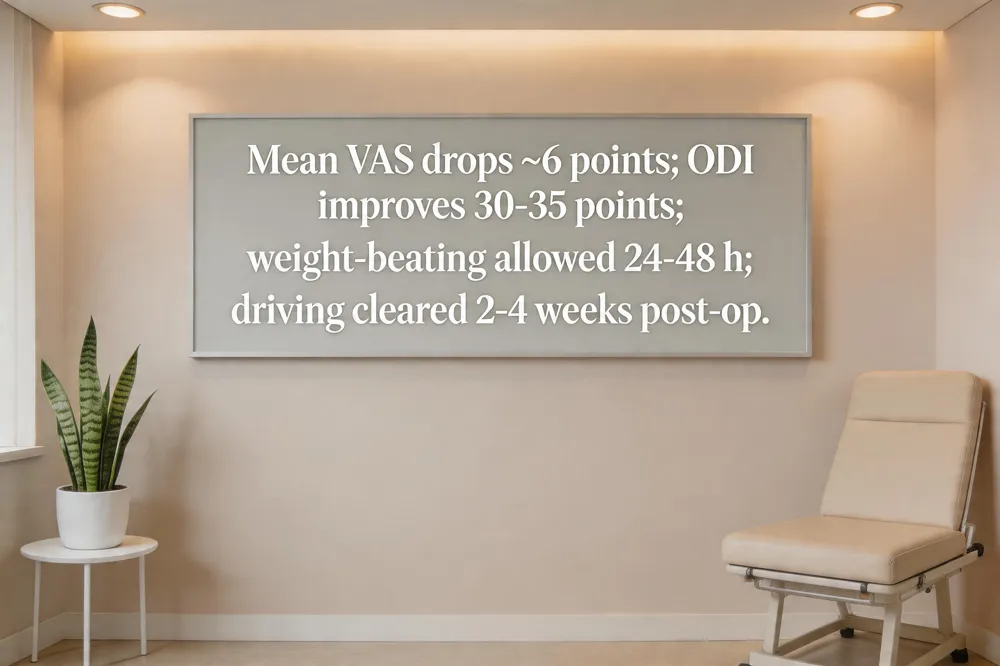 Minimally invasive sacroiliac (SI) joint fusion yields rapid and durable pain relief. In a 43‑patient series, Mean VAS pain reduced from 7.52 ± 1.3 pre‑op to 1.43 ± 1.22 at 12 months (p < 0.05) and functional disability improved by roughly 30‑35 ODI points on the Oswestry Disability Index (ODI). Radiologic fusion rates: 61% at 6 months, 96.4% at 12 months, 100% at 18 months support the clinical gains.