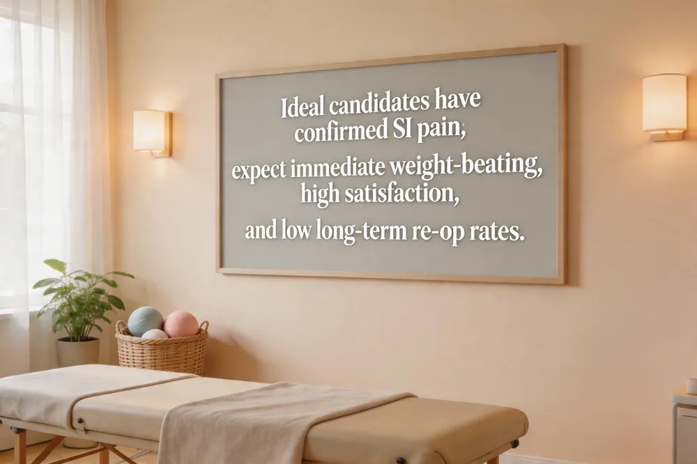 Patient‑focused decision points – Ideal candidates have confirmed SI‑joint pain (diagnostic block ≥50% relief) and have exhausted 6‑12 months of conservative therapy. Key risk factors that may lower success include smoking, uncontrolled diabetes, and poor bone quality. Patients should expect immediate weight‑bearing after surgery, a brief rehab period, and a high satisfaction rate (≈85‑90% would choose the procedure again).
