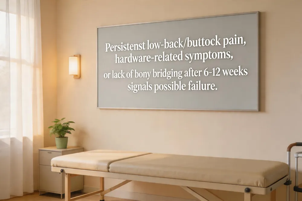 When these signs persist beyond the expected postoperative recovery window (typically 6–12 weeks) or if imaging shows lack of bony bridging (pseudarthrosis), patients should be evaluated for revision surgery. Early referral for repeat CT or X‑ray, assessment of implant integrity, and discussion of revision options can prevent chronic disability and improve outcomes.