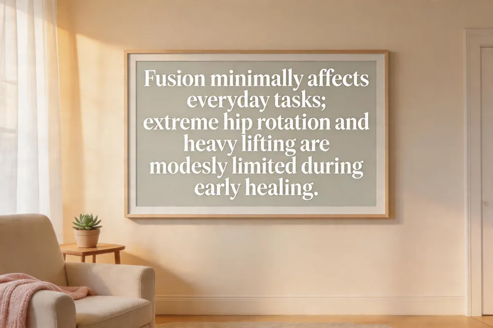 The sacroiliac (SI) joint normally moves only a few degrees – roughly 2‑4° of rotation and 1‑2° of tilt – to transmit weight between the spine and pelvis. Because this range is already minimal, fusion does not noticeably affect everyday tasks such as walking, sitting, bending, or climbing stairs. What changes is the joint’s ability to perform extreme motions (deep hip rotation, hyper‑extension, or heavy lifting that place the SI joint under high shear forces). Patient‑reported functional limitations are therefore modest: most patients return to normal activities within weeks, while high‑impact sports or very deep squats may feel slightly restricted during the early healing phase. Physical therapy plays a crucial role, emphasizing core stabilization, gradual weight‑bearing, and tailored strengthening to compensate for the lost micro‑motion and to protect the fusion site.