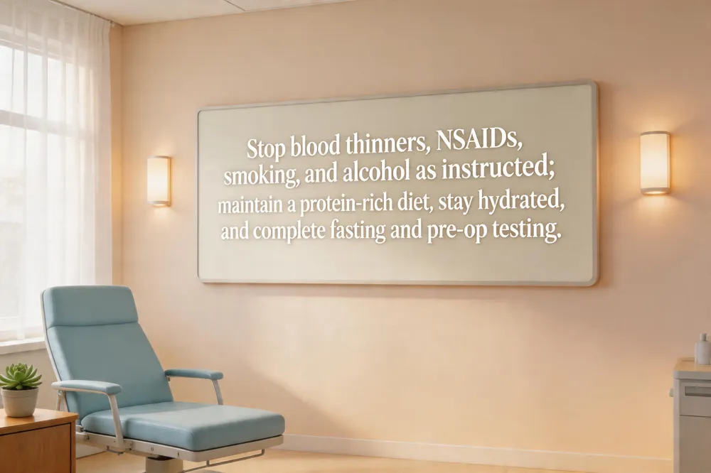 Medication and supplement management – Bring a complete list of prescription drugs, over‑the‑counter medicines, and herbal supplements to your pre‑op visit; your surgeon will tell you which to pause (e.g., blood thinners, NSAIDs) to prevent bleeding and drug interactions.
