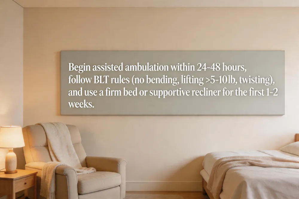 During the first 1‑2 weeks, a firm bed is safest; a recliner with solid lumbar support can be used briefly for bathroom trips, keeping hips and knees at ~90°, but should not replace a supportive mattress.