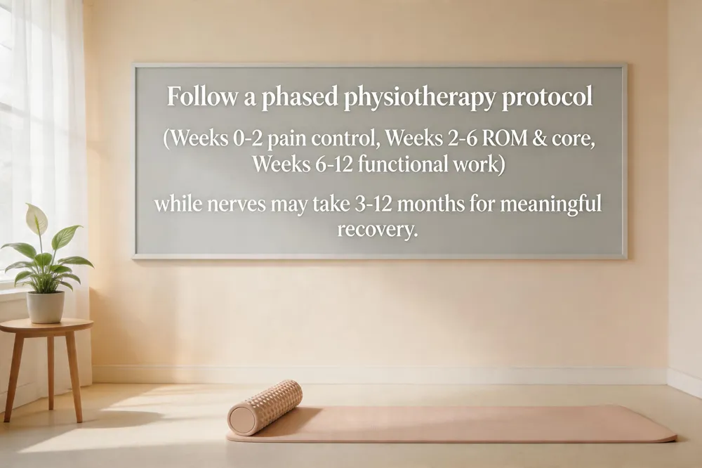 Spinal surgery physiotherapy PROTOCOL – Weeks 0‑2 concentrate on pain control, wound care, diaphragmatic breathing and isometric glute/quads activation while avoiding bending or twisting. Weeks 2‑6 introduce supervised ROM, hip/hamstring stretches, neural glides, low‑impact aerobic conditioning and core‑pelvic stabilization. Weeks 6‑12 advance to multi‑plane core work, balance, functional movement patterns and work‑hardening, aiming for pain‑free ADLs and the ability to lift ~20 lb.