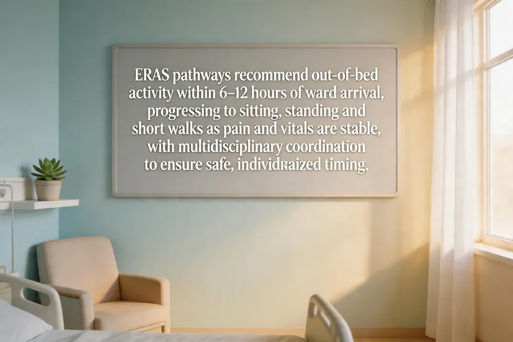 Early mobilization is a cornerstone of Enhanced Recovery After Surgery (ERAS) pathways for both orthopedic and spine procedures. ERAS protocols recommend that patients begin out‑of‑bed activities within the first 6–12 hours after arrival to the ward, progressing to sitting, standing, and short walks as soon as pain and hemodynamics are stable. Multidisciplinary coordination—surgeons, anesthesiologists, nurses, and physical therapists—ensures safe progression and individualized timing.