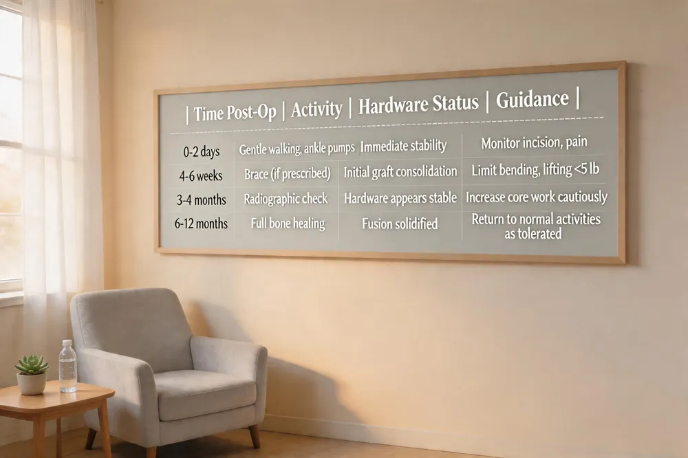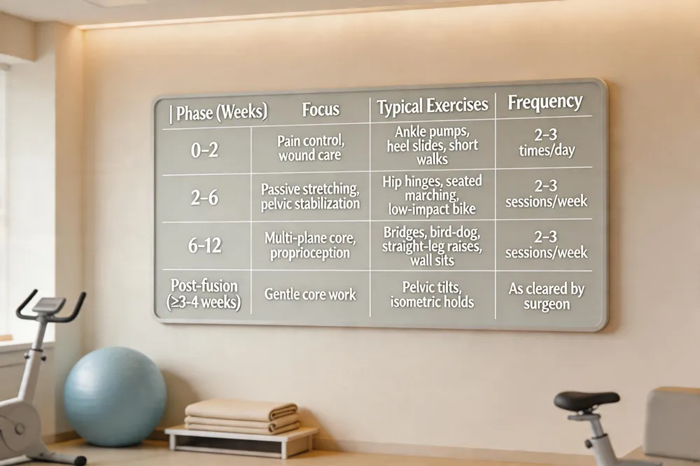 | 1‑2 weeks | Structured PT for fusion after surgeon clearance | Core activation, gradual strengthening, radiographic healing confirmed |