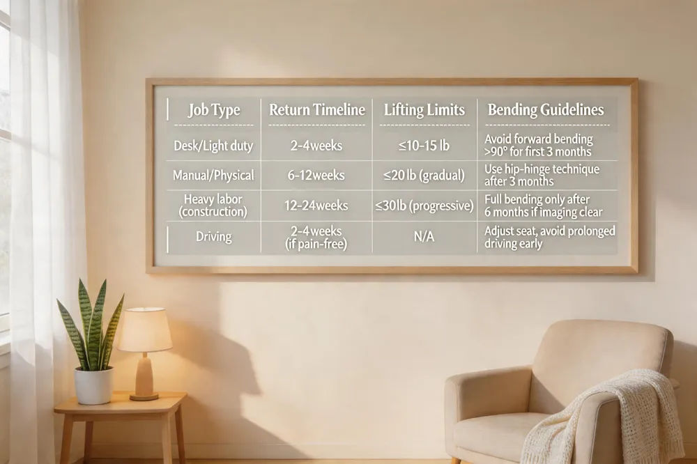 Timeline for returning to work varies by job demand: desk‑based or light‑duty roles often resume by weeks 2–4, while physically demanding jobs may require 6–12 weeks or longer, contingent on pain control and therapist clearance.