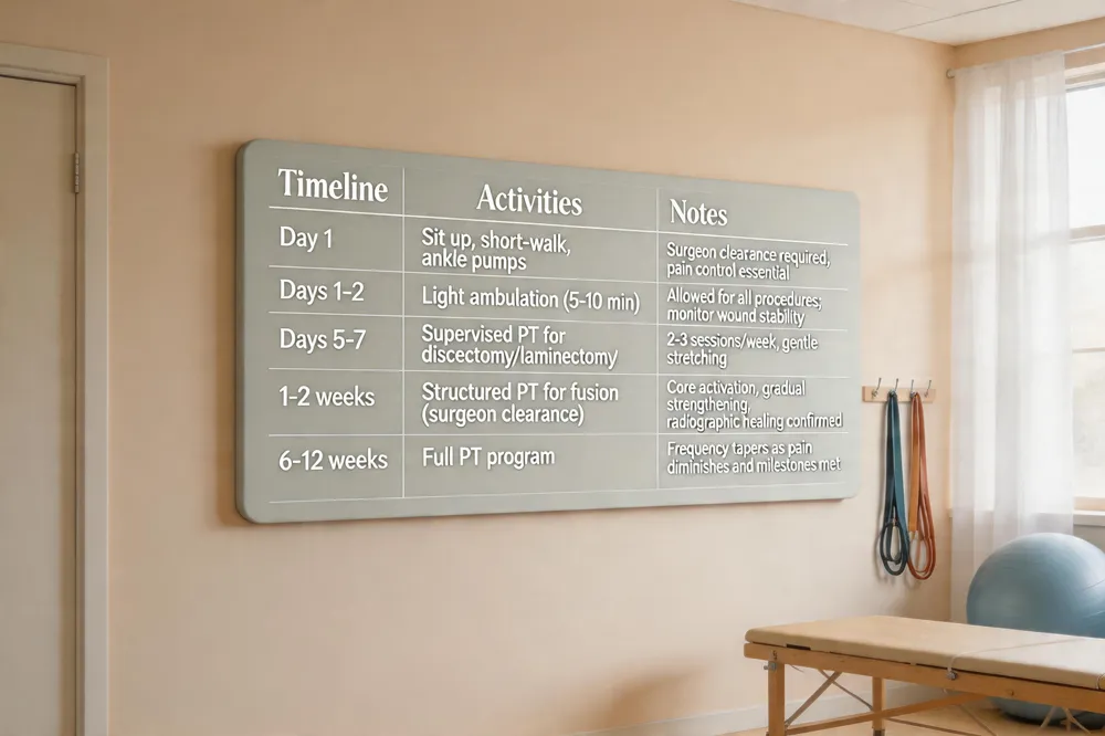 Begin physical therapy only after the surgeon confirms the incision is stable—often within the first 48‑72 hours for minimally invasive discectomy and by day 1‑3 for fusion. Early, low‑impact activities such as short walks, ankle pumps, and diaphragmatic breathing protect the surgical site while promoting circulation.