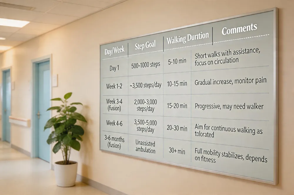 How long does it take to walk after spinal surgery? Patients are encouraged to begin walking the day after surgery; unassisted walking typically develops within 3–4 weeks for laminectomy and up to 6 months for fusion, with faster progress in minimally invasive cases.