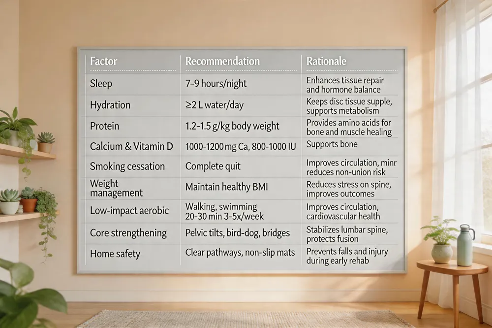 | Weight management | Maintain healthy BMI | Reduces stress on spine, improves outcomes |